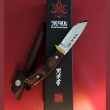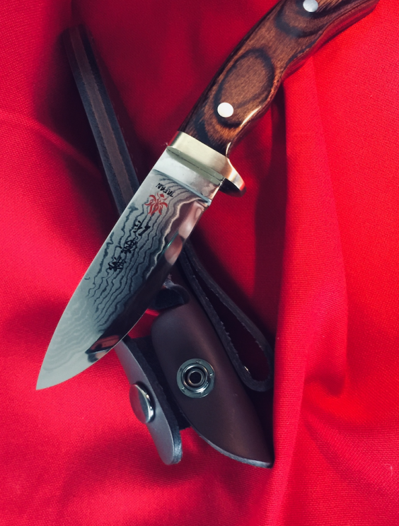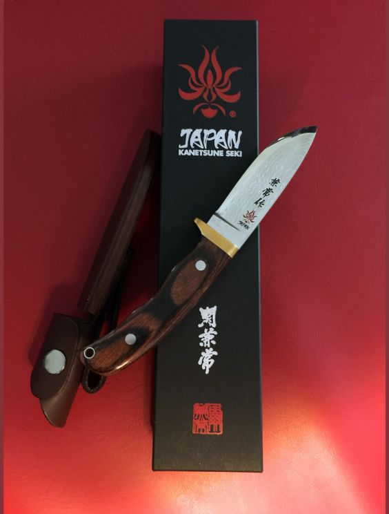 This ‘Drop Point’ or ‘Skinner’ from Kanetsune really is a piece of art (but functional).The KB551 is fully made in Japan with a forge of Rockwell C hardness of 61 and a vg10 Damascus blade with a flat grind from spine to edge. Certainly an eye catching piece, as the finish and fitup work on the Mahogany Micarta handle is faultless.It is a Full tang knife with a lanyard hole and a beautiful brass thumb guard with impeccable fit and finish.This knife is a very comfortable fit in your hand when moving it around for those various tasks that easily suit the flat grind Drop Point Blade.Strong visual Damascus pattern from the 33 layer blade and beautifully embossed with pride.The pouch is of fine leather and is also embossed with Kanetsune’s emblem with a polished wood separator for the blades’ edge. Without a doubt, this is a lifetime item that would make an incredible gift too.